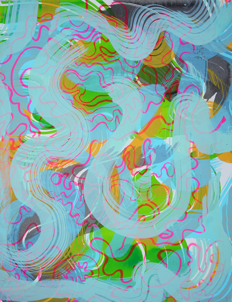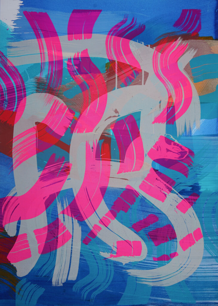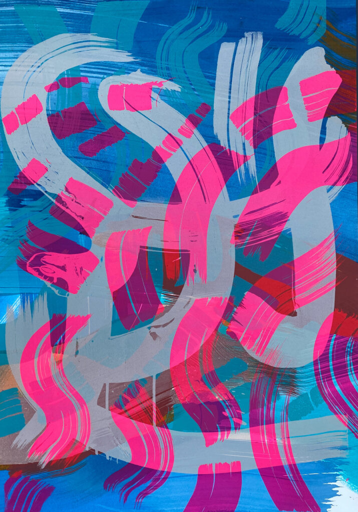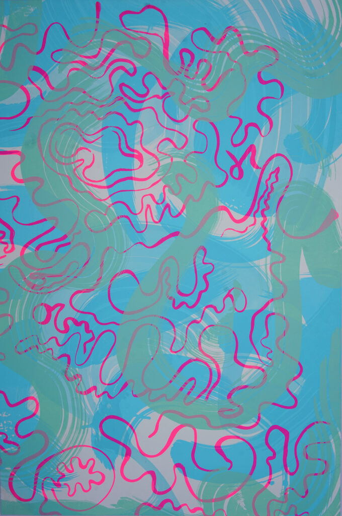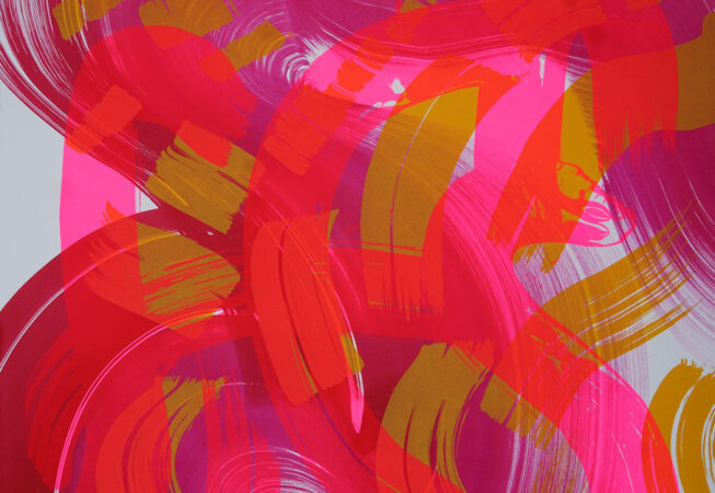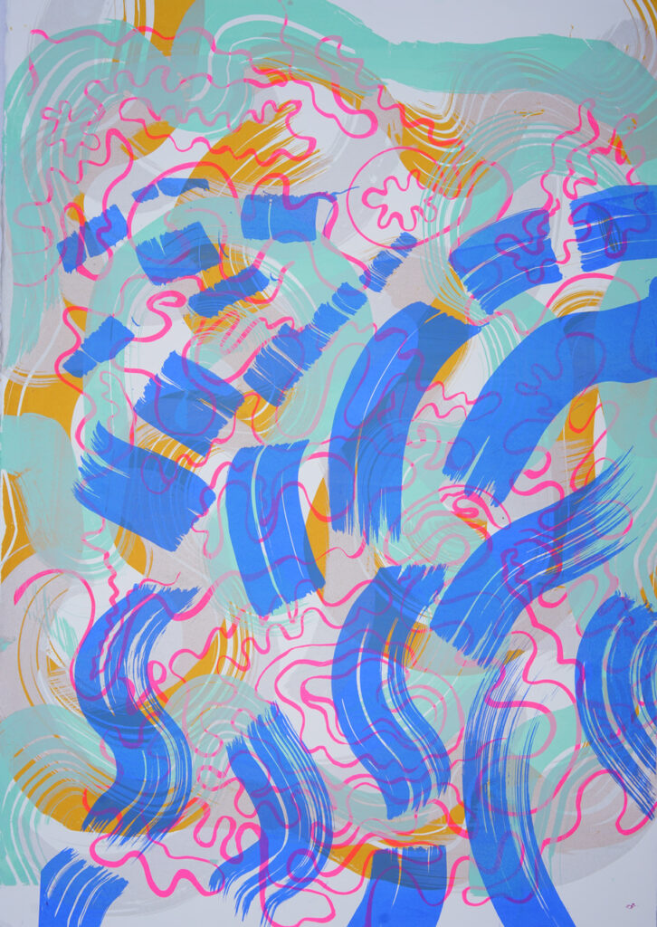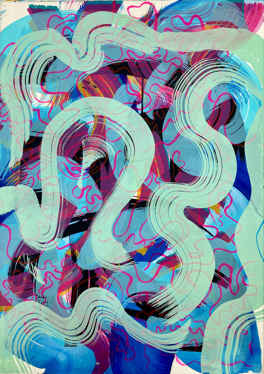 Ein Experiment mit transparenten Ebenenschichten, deren Überlagerung räumliche Tiefe erzeugt. Variierende Farbklänge formen wechselnde Atmosphären, während die Bewegung der Pinselstriche im Raum den Moment spürbar werden lässt.