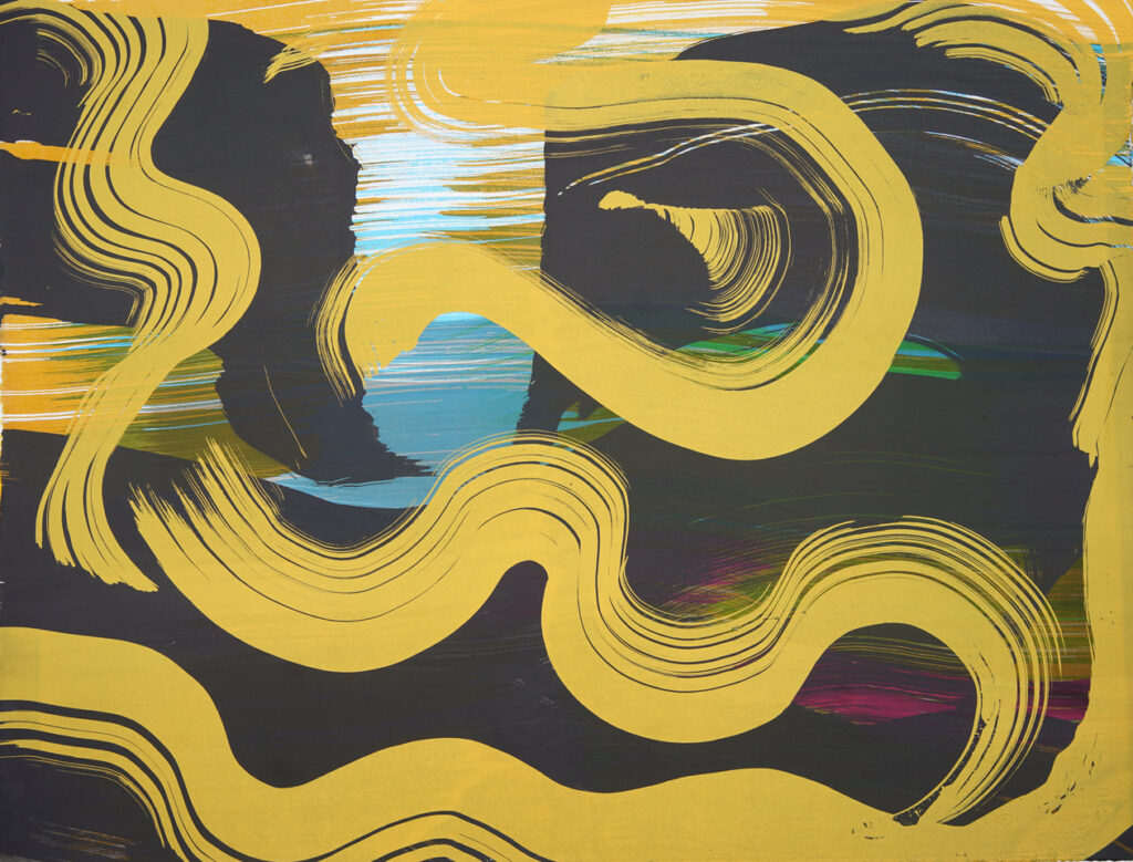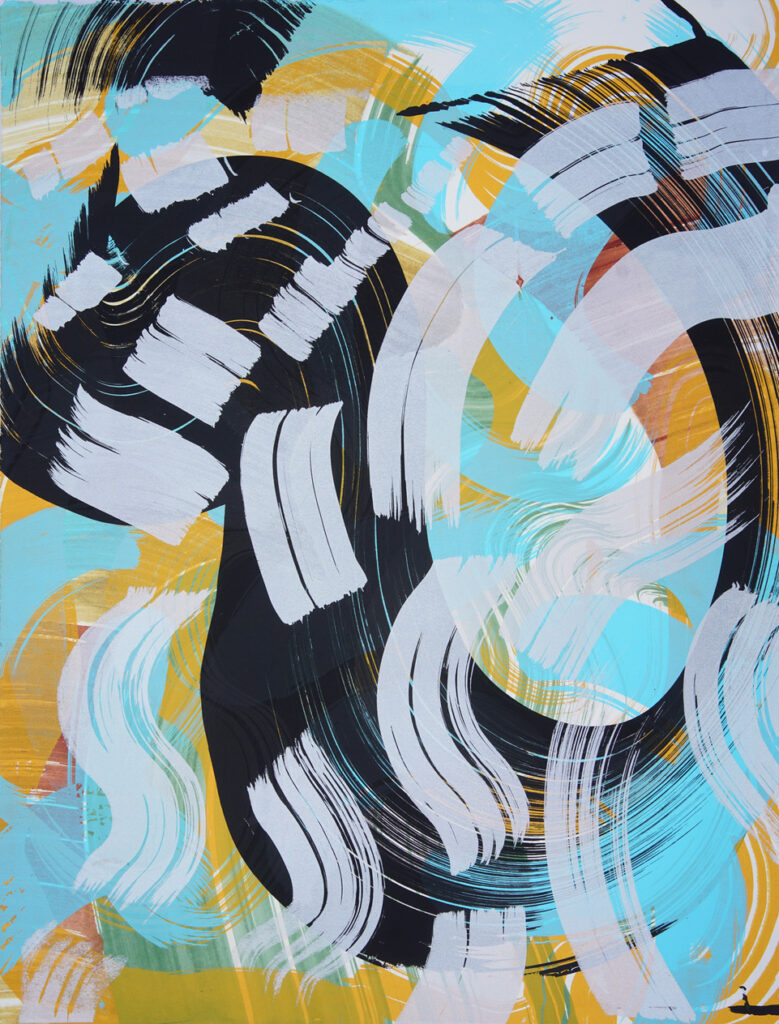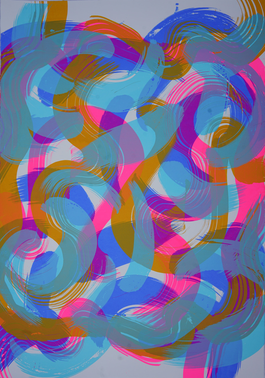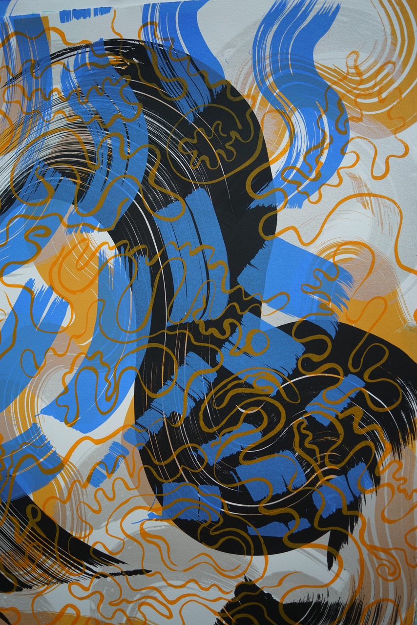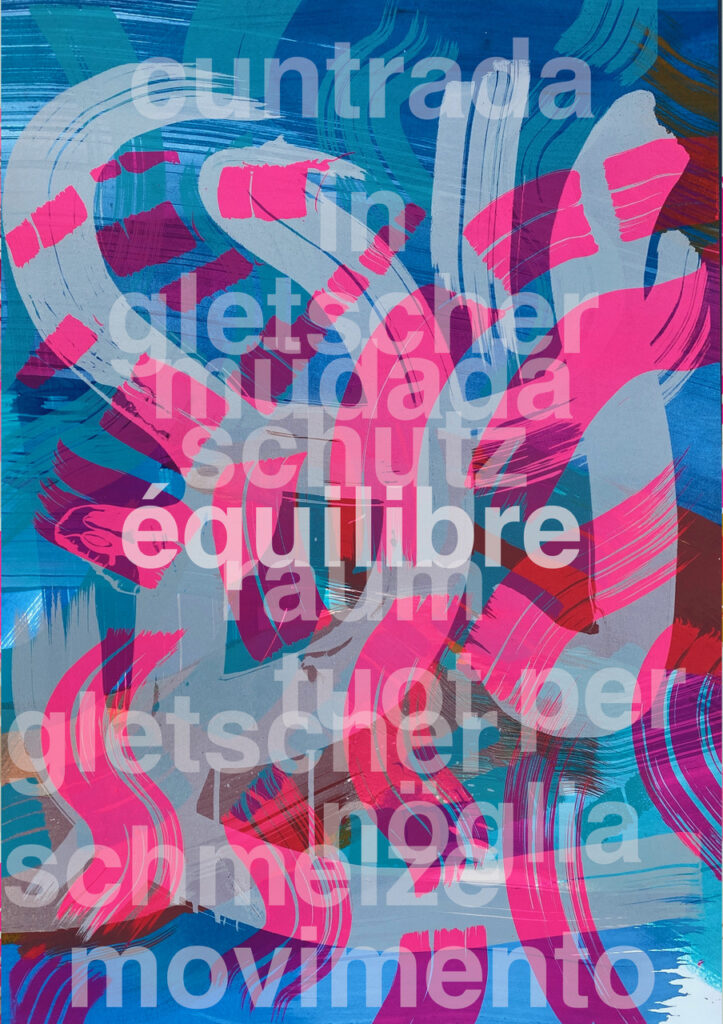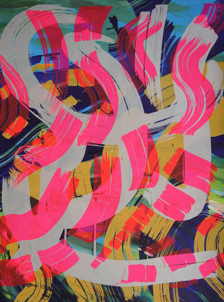 Ein Experiment mit transparenten Ebenenschichten, deren Überlagerung räumliche Tiefe erzeugt. Variierende Farbklänge formen wechselnde Atmosphären, während die Bewegung der Pinselstriche im Raum den Moment spürbar werden lässt.