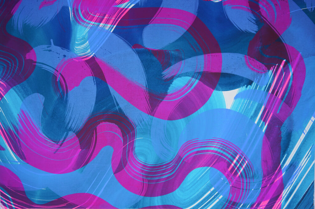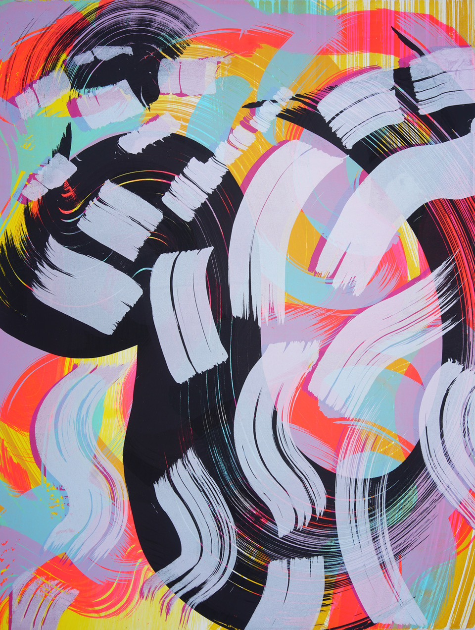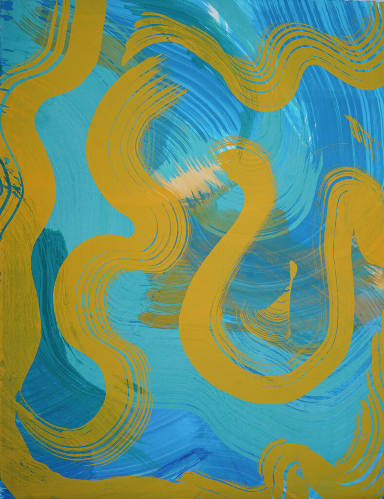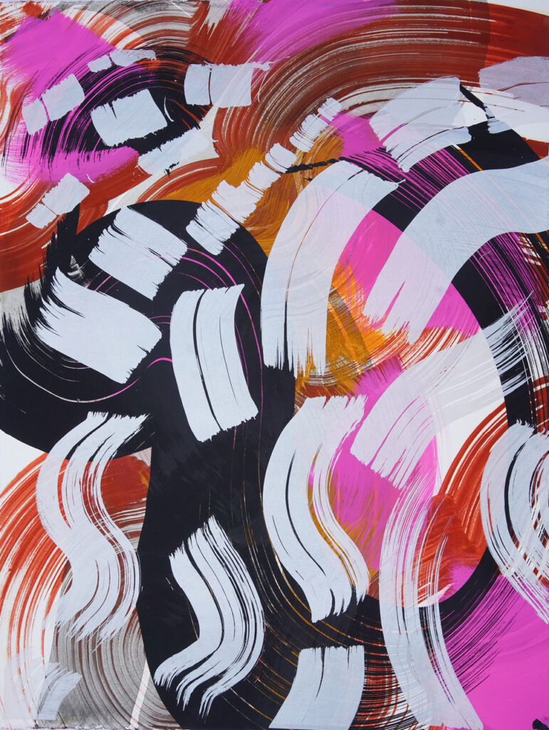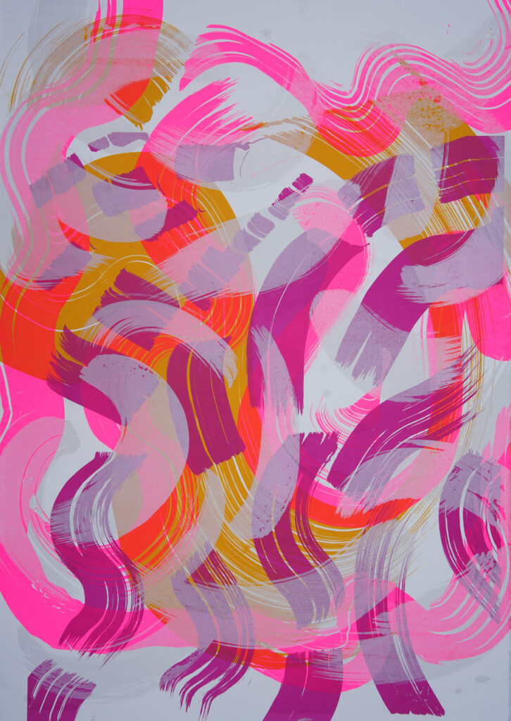 Ein Experiment mit transparenten Ebenenschichten, deren Überlagerung räumliche Tiefe erzeugt. Variierende Farbklänge formen wechselnde Atmosphären, während die Bewegung der Pinselstriche im Raum den Moment spürbar werden lässt.