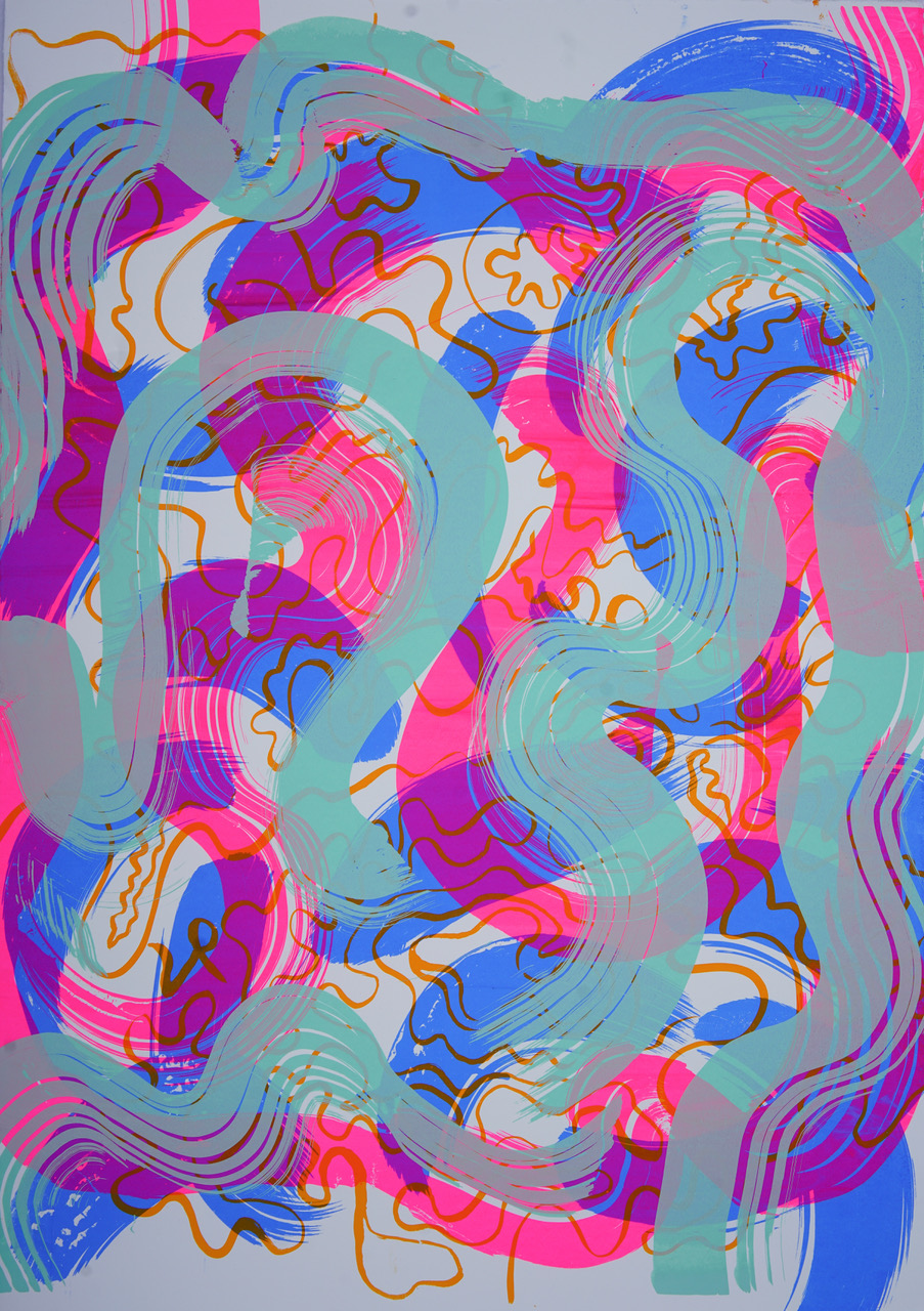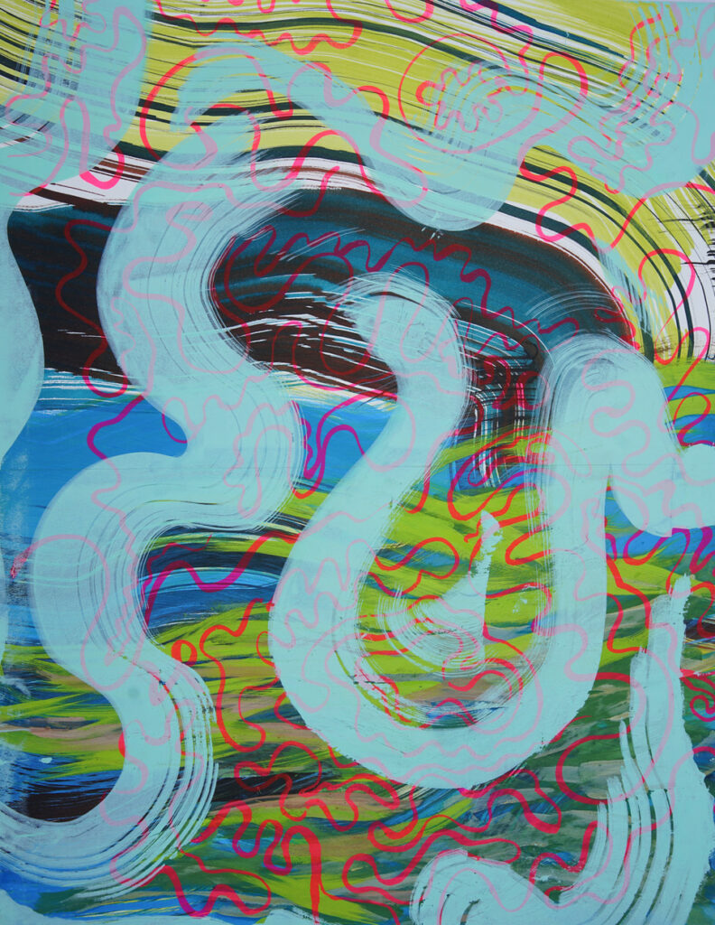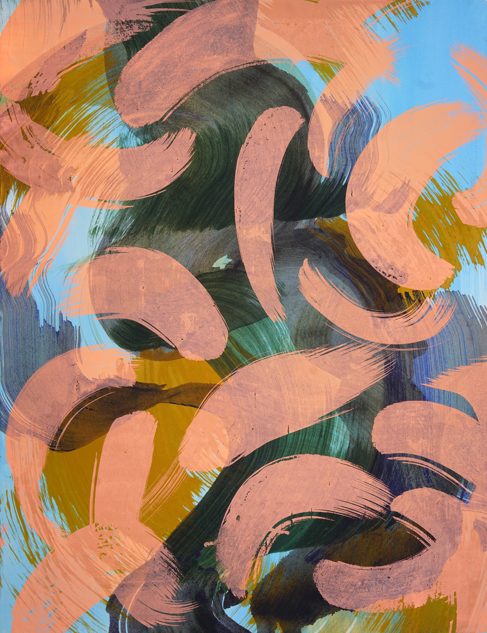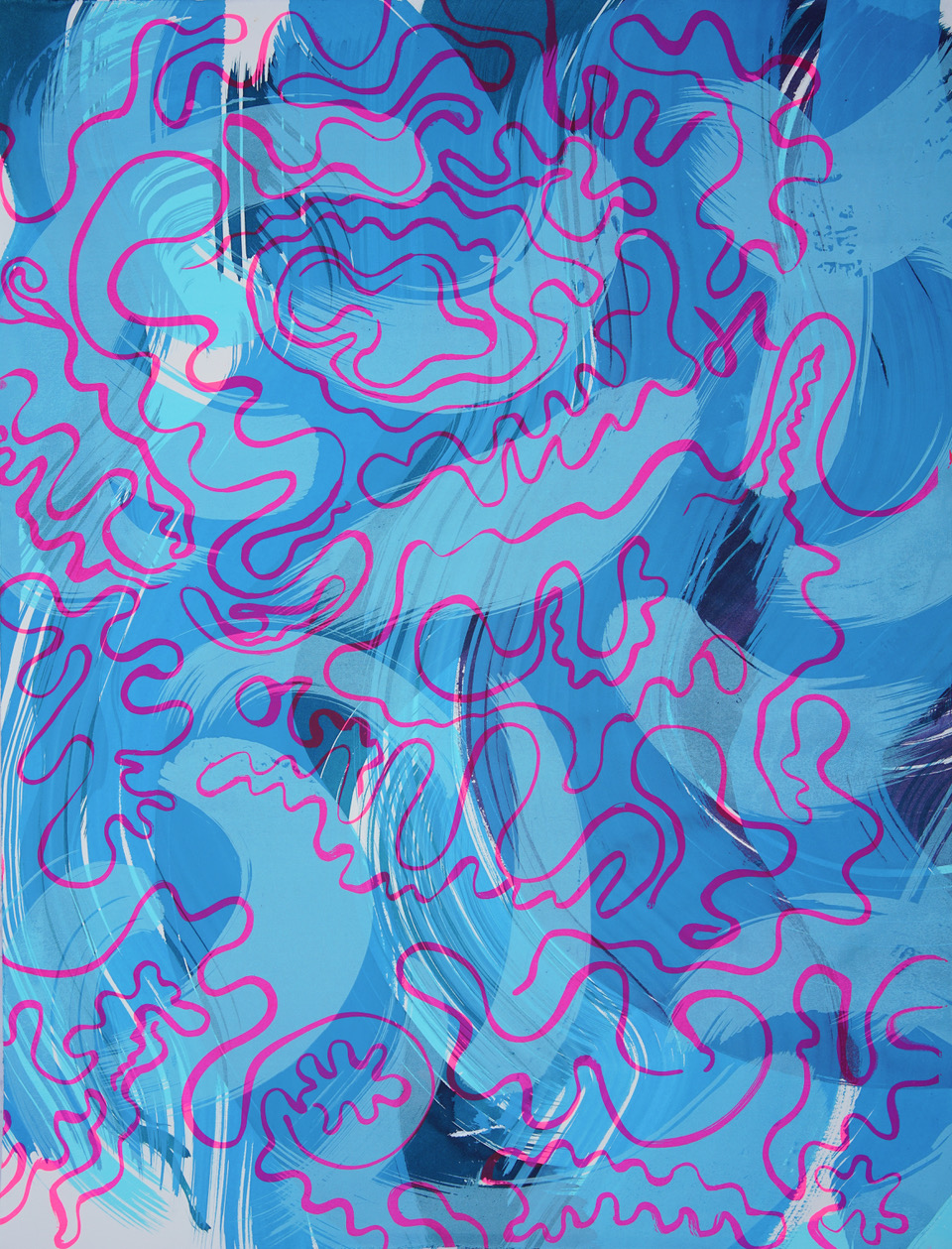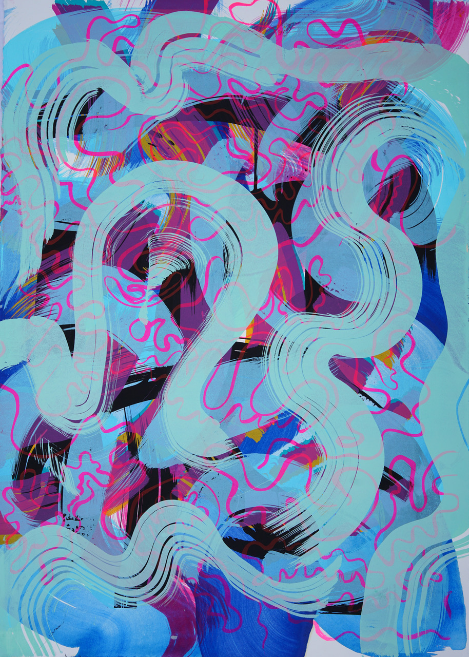Ein Experiment mit transparenten Ebenenschichten, deren Überlagerung räumliche Tiefe erzeugt. Variierende Farbklänge formen wechselnde Atmosphären, während die Bewegung der Pinselstriche im Raum den Moment spürbar werden lässt.
