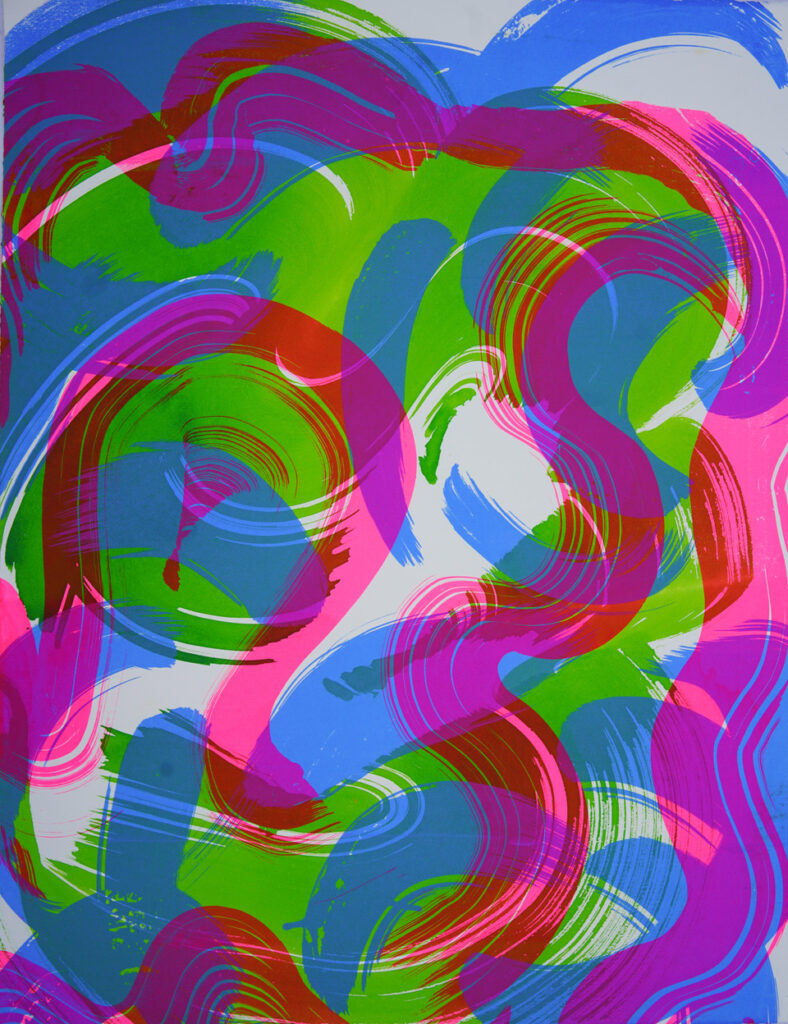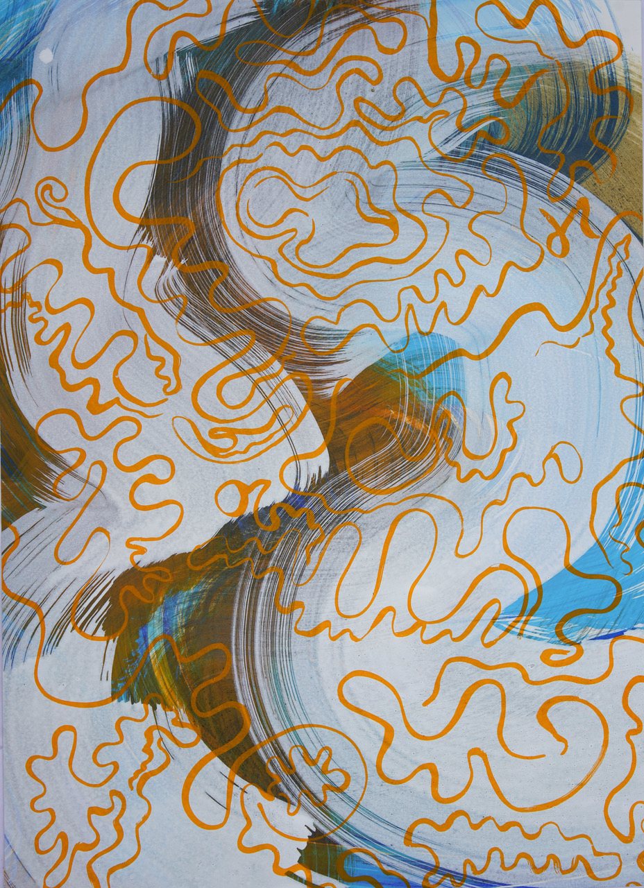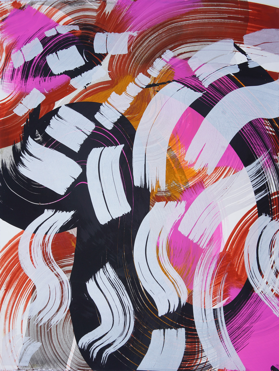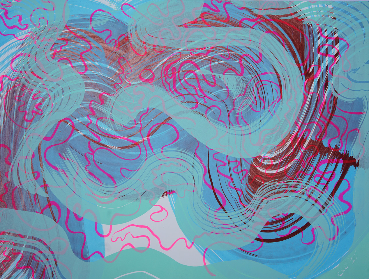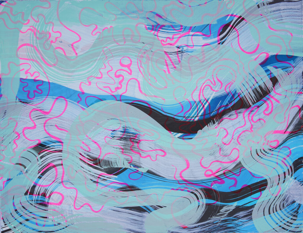 Ein Experiment mit transparenten Ebenenschichten, deren Überlagerung räumliche Tiefe erzeugt. Variierende Farbklänge formen wechselnde Atmosphären, während die Bewegung der Pinselstriche im Raum den Moment spürbar werden lässt.